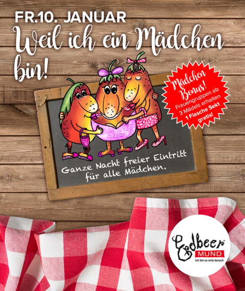Erdbeermund Singen Otto-Hahn-Str. 5,Singen (Hohentwiel),GermanyWeil ich ein Mädchen bin!!! Wei ich ein Mädchen bin ist… Eine säuft. Eine heult. Eine kichert irre vor sich hin. Zwei rennen schreiend durch den Club. Eine steht beim DJ und macht sich über den Rest der Truppe lustig… Frauen haben die ganze Nacht freien Eintritt. Unsere Getränkeaktionen: jede 3er Gruppe Frauen erhält eine… Weiterlesen »Weil ich ein Mädchen bin im Erdbeermund Singen
