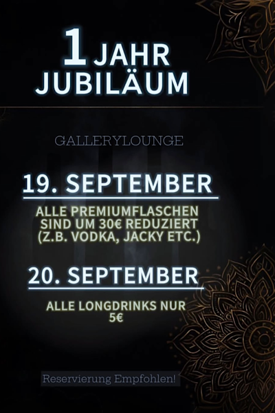 Gallery Lounge Konstanz Fritz-Arnold-Straße 7,Konstanz,GermanyLasst uns gemeinsam anstoßen Jetzt wird gefeiert - mit Euch! 19.09: Premiumflaschen 30€ günstiger 20.09: Alle Longdrinks nur 5€ Reservierung empfohlen! Gallerylounge - only the vibes you need #shsiha #bar #feiern #jubiläum #dj #drinks #flaschen #freunde #freitag #samstag
