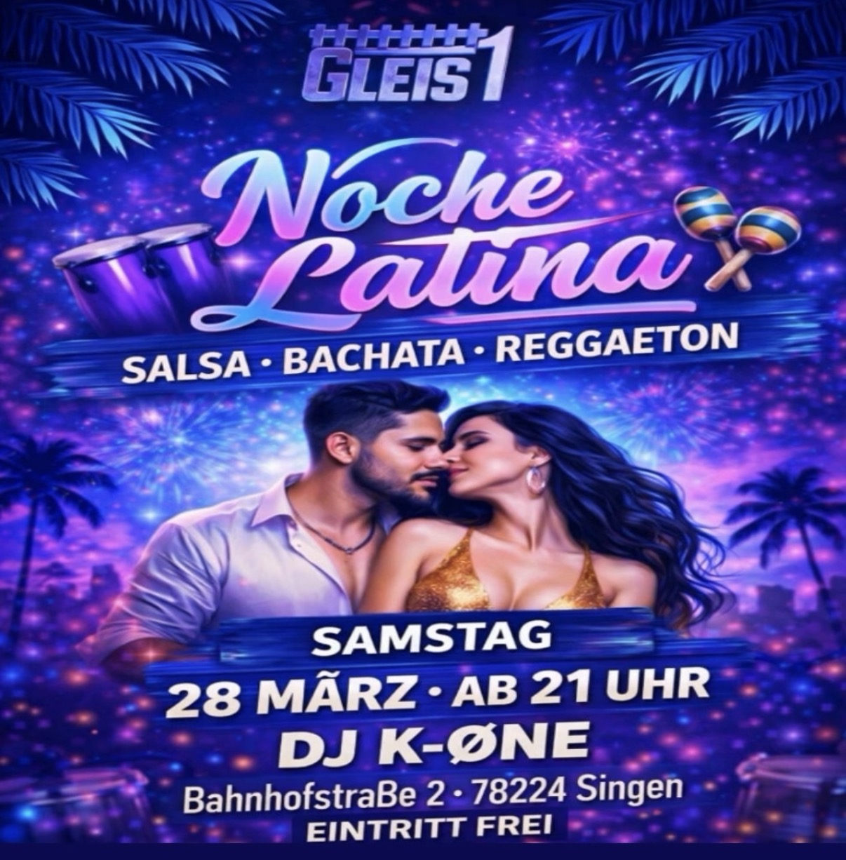 Gleis1 Singen Bahnhofstrasse 2,Singen,GermanyNOCHE LATINA - EINE NACHT VOLLER FEUER! Erlebe eine unvergessliche, heiße Latin Night im Gleis 1 Singen! Freu dich auf mitreißende Rhythmen, pure Lebensfreude und eine einzigartige Atmosphäre. Leckere Drinks & köstliches Essen warten auf dich 2 Spüre den Rhythmus von Salsa, Bachata & Reggaeton DJ K-ØNE an den Decks sorgt für die perfekte Party-Stimmung… Weiterlesen »Noche Latina – Gleis 1 Singen