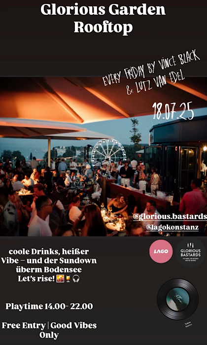 Glorious Bastards Konstanz Bodanstraße 1,Konstanz,Germanycoole Drinks, heißer Vibe - und der Sundown überm Bodensee Let's rise! @GLORIOUS BASTARDS @LAGOKONSTANZ NEW MELODIC HOUSE SET Playtime 14.00- 22.00 Free Entry | Good Vibes Only