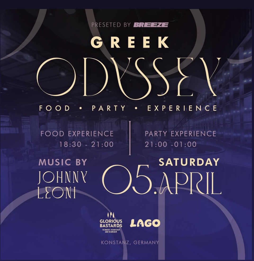 Glorious Bastards Konstanz Bodanstraße 1,Konstanz,GermanyGREEK ODYSSEY 2.0 05.04.25 / 18.30-01.00 Uhr DM FOR TABLE RESERVATION! Instagram @breezevibes.ofc Location Secret Club