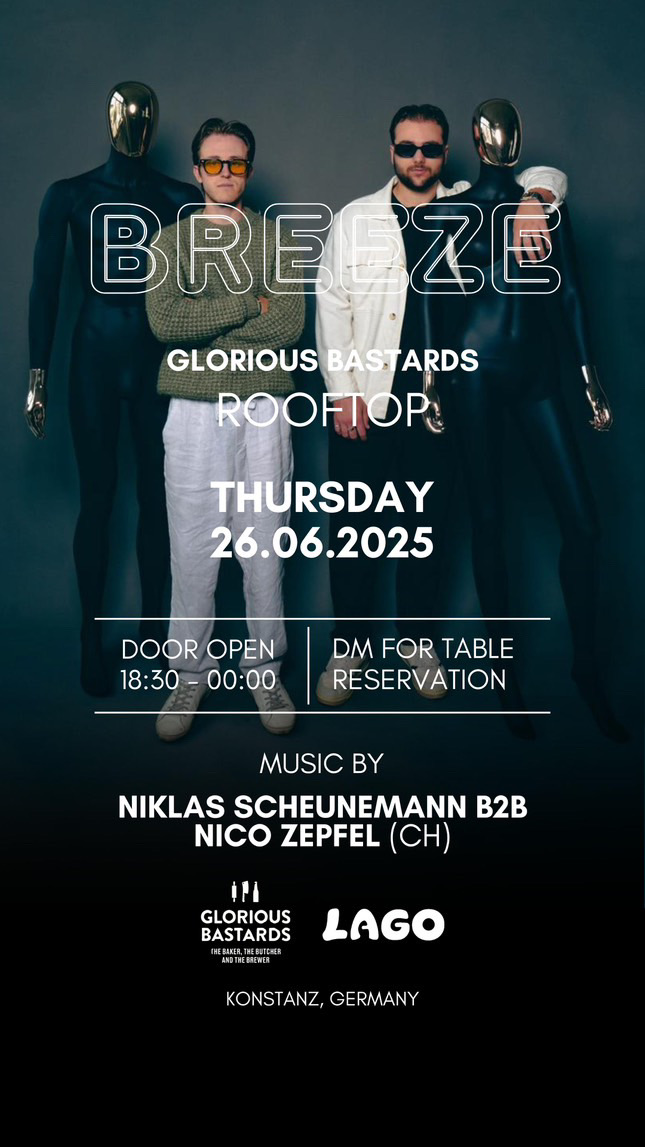 Glorious Bastards Konstanz Bodanstraße 1,Konstanz,GermanyBREEZE AFTER WORK Rooftop Re-Opening 17.04.25 / 16.00-22.30 Uhr DJ @efinho27 16-17.30 Uhr DJ @nico.zepfel 17.30-22.30 Uhr