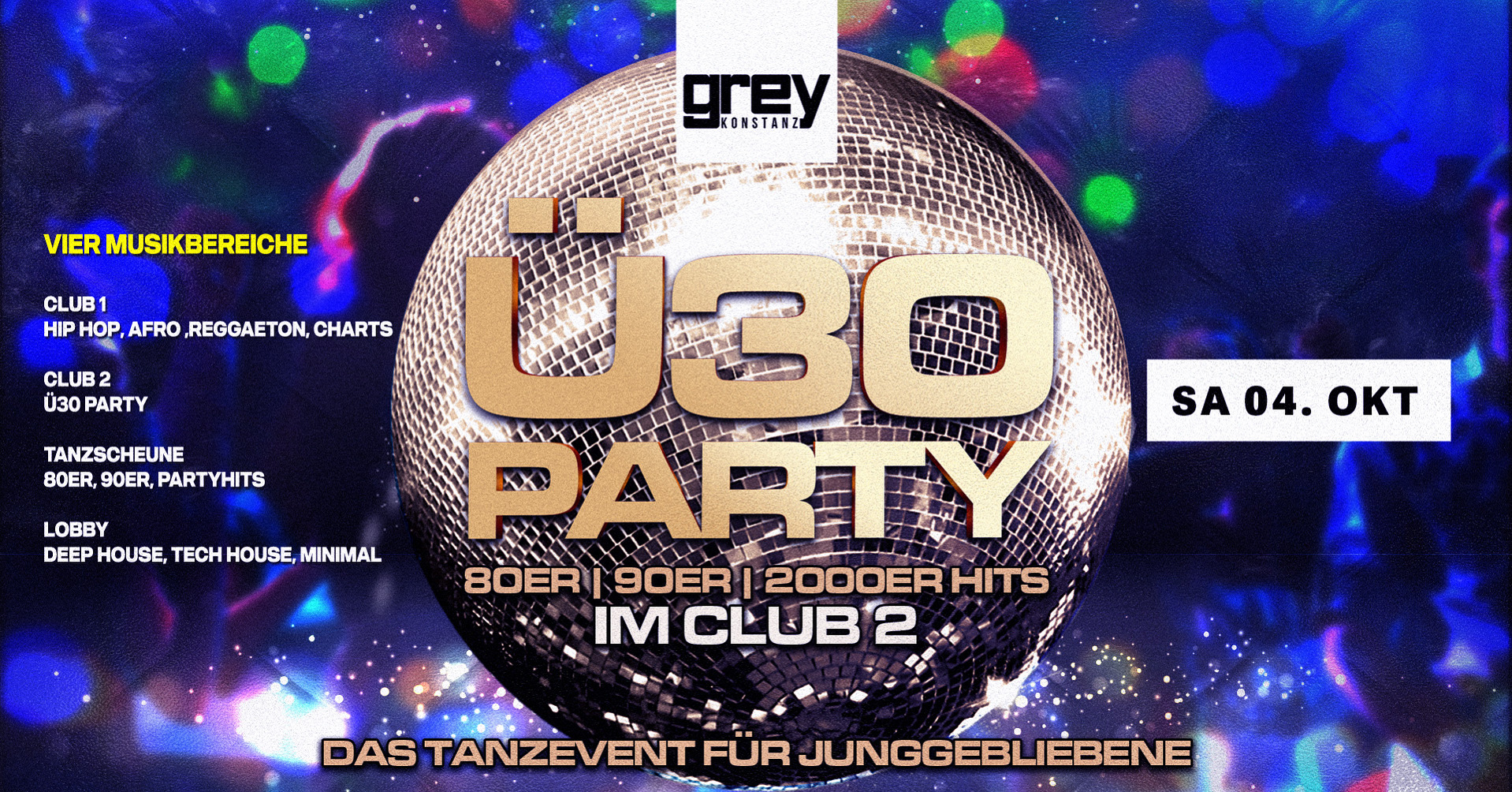 Grey Konstanz Max-Stromeyerstr. 33,Konstanz,GermanyDIE MEGA 30 PARTY MUSIKPROGRAMM: 🔈 BESTE AUS DEN 80ER, 90ER & 2000ER DAS TANZ-EVENT FÜR JUNGGEBLIEBENE! 🎉 Das könnt ihr bei uns im CLUB 2 mit dem besten Mix aus ✨80ER, 90ER & 2000er Hits und die aktuellen Charts ✨garantiert denn unsere🔥 Resident DJs🔥 werden Euch die Hüften zum schwingen bringen!
