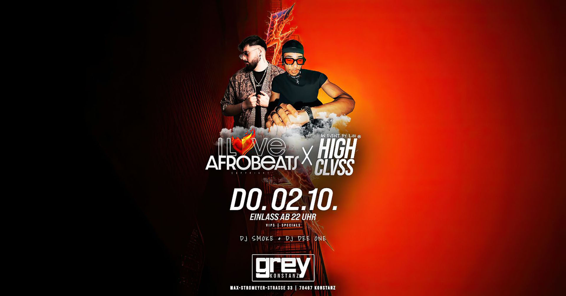 Grey Konstanz Max-Stromeyerstr. 33,Konstanz,GermanyI LOVE AFRO BEATS ❌ HIGH CLVSS PARTY AUF 4 FLOORS Das darfst du nicht verpassen! 🔥 Am Donnerstag, 02. Oktober steigt im Grey Konstanz die größte Collabo am Bodensee: I Love Afrobeats x High Clvss! Ab 22 Uhr verwandelt sich der Club in ein Epizentrum voller Energie, Beats und unvergesslicher Vibes. Mit DJ Smoke… Weiterlesen »I LOVE AFRO BEATS ❌ HIGH CLVSS – Grey Konstanz