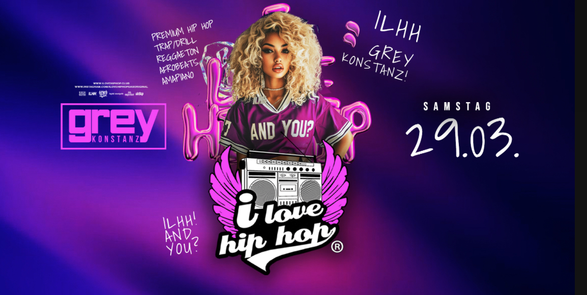 Grey Konstanz Max-Stromeyerstr. 33,Konstanz,GermanyPARTY AUF 4 FLOORS I LOVE HIP HOP DAS ORIGINAL Deutschland größtes Hip Hop Event in der größten Disco am Bodensee. GREY Konstanz Big energy, bigger than ever! NEXT DATE: Saturday 29.03.25 You better be there. ILHH! AND YOU? 💕
