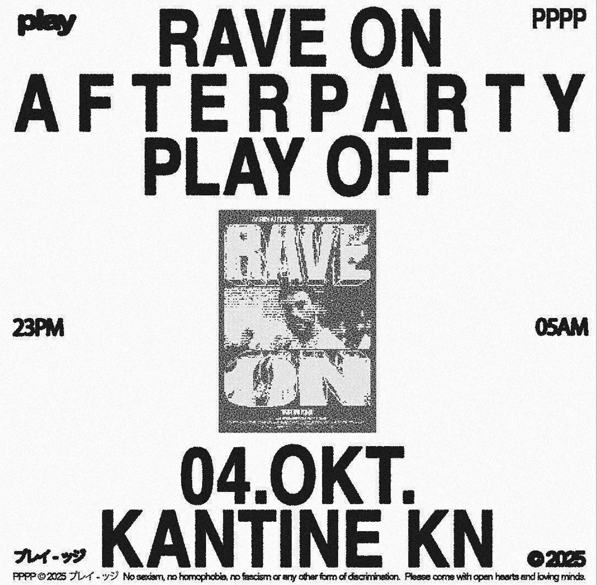 Kantine Konstanz Oberlohnstraße 3,Konstanz,GermanyPLAY @kantinekn Samstag 04.0kt. 2025 RAVE ON Afterparty DJ Hazeschaden Garnele Play Crew FILM @zebrakino 21:00 Uhr AFTERRAVE Kantine Konstanz 23:00 Uhr KOMBI TICKETS FILM + PARTY AVAILABLE NOW! zebra-kino.de/tickets © 2025プレイ-ッジ No sexism, no homophobia, no fascism or any other form of discrimination. Please come with open hearts and loving minds.