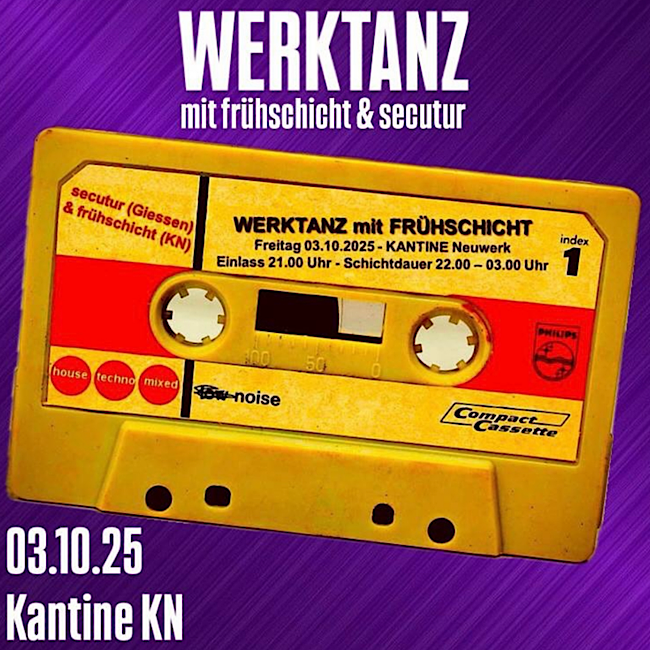 Kantine Konstanz Oberlohnstraße 3,Konstanz,GermanyFEIERtage sind zum FEIERN da. Deshalb habt ihr am 3. Oktober auch keine Ausreden, wenn die Kantine ihre Tore wieder zum großen WERKTANZ öffnet. Zwei Generationen, ein Ziel: Abriss. FRÜHSCHICHT & SECUTUR drehen die Regler hoch und jagen euch mit verschiedensten Genres (u.a. Tech House, Funk, Techno, Mixed) quer über den Dancefloor. Wie die OGs… Weiterlesen »Werktanz – Kantine Konstanz