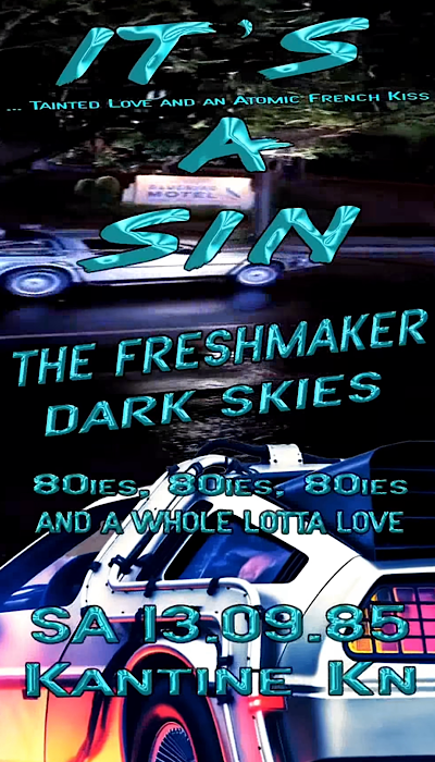 Kantine Konstanz Oberlohnstraße 3,Konstanz,GermanyWhere we're going we don't need roads! Join us and ride with our time machine into the greatest century of pop culture. Dance and sing to the evergreens from the 80s get surprised by some rare gems of that time you might have never heard before! The Freshmaker and Dark Skies will spin you right… Weiterlesen »Freshmaker – Kantine Konstanz