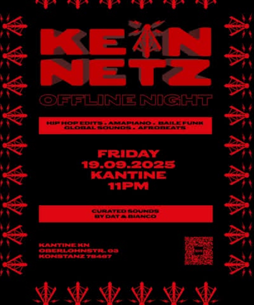 Kantine Konstanz Oberlohnstraße 3,Konstanz,GermanyFROM THE TERRACE TO DA CLUB ON FRIDAY, SEPTEMBER 19, 2025 WE'LL BE STANDING BEHIND THE DECKS IN A REAL CLUB FOR THE VERY FIRST TIME - @kantinekn KONSTANZ FOR US, THIS IS A HUGE HONOR - WE'VE GOT THE WHOLE NIGHT AHEAD OF US AND WE WANT TO FILL THE PLACE TOGETHER WITH YOU… Weiterlesen »Kein Netz – Kantine Konstanz