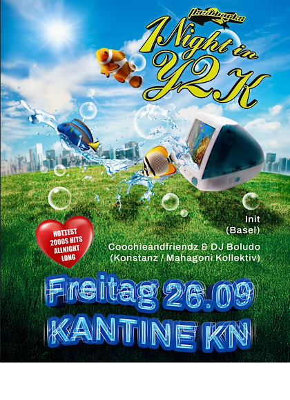 Kantine Konstanz Oberlohnstraße 3,Konstanz,GermanyFreitag 26.09. | 23:00 - 05:00 | @kantinekn Wir reisen mit euch zurück in 2000er, schnapp dir dein Flip Phone und schmeiß dich in dein liebstes Y2K-Outfit MIXED MUSIC / RNB / HIP HOP / POP / DANCE Sounds by: @coochieandfriendz (Konstanz /@mahagonikollektiv) DJ Boludo @dj_kamikawaii (Konstanz /@mahagonikollektiv ) Init @nm.reisch (Basel) No sexism, no… Weiterlesen »1Night in Y2K – Kantine Konstanz