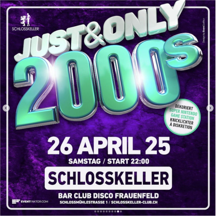 Schlosskeller Frauenfeld Schlossmühlestrasse 1,Frauenfeld,SwitzerlandDie ultimative Zeitreise in die 2000er Jahre erwartet dich im Schlosskeller Frauenfeld! Tauche ein in die Welt der besten Hits und unvergesslichen Klassiker dieses großartigen Jahrzehnts. 𝙎𝙥𝙚𝙘𝙞𝙖𝙡𝙨: Coole Dekoration: Für das perfekte 2000er-Feeling Super Nintendo Game Station: Gaming-Kick garantiert! Knicklichter: Für die perfekte Party-Atmosphäre Diskretion: Für all deine geheimen Lieblingshits Erlebe eine Nacht voller Nostalgie,… Weiterlesen »JUST & ONLY 2000’s Party im Schlosskeller Frauenfeld