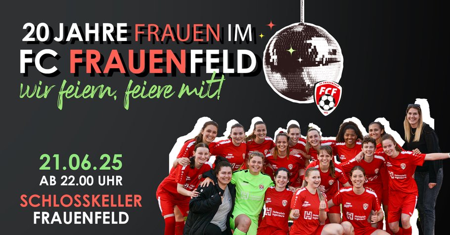 Schlosskeller Frauenfeld Schlossmühlestrasse 1,Frauenfeld,Switzerland20 JAHRE FRAUENPOWER – WIR FEIERN MIT EUCH! Der FC Frauenfeld feiert das 20-jährige Jubiläum seiner Frauenmannschaft – und ihr seid herzlich eingeladen! Nach einem offiziellen Teil für geladene Gäste öffnen wir ab 22.00 Uhr die Türen des Schlosskellers für alle, die mit uns feiern möchten. Freut euch auf einen mitreissenden Open Format DJ, der… Weiterlesen »20 JAHRE DAMEN FC FRAUENFELD im Schlosskeller Frauenfeld