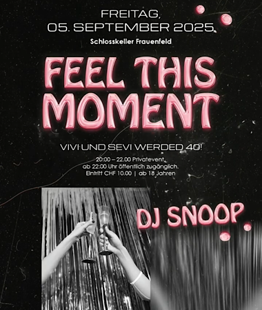 Schlosskeller Frauenfeld Schlossmühlestrasse 1,Frauenfeld,SwitzerlandFEEL THIS MOMENT Wir feiern gleich doppelt: Vivi & Sevi werden 40 - und ab 22 Uhr öffnen wir die Tore für alle! Freitag, 05. September 2025 Schlosskeller Frauenfeld DJ Snoop sorgt für den Soundtrack der Nacht 20-22 Uhr Privatevent ab 22 Uhr öffentlich - Eintritt CHF 10.- | ab 18 Jahre #schlosskeller #2bevents #schlosskellerfrauenfeld… Weiterlesen »Feel this moment – Schlosskeller Frauenfeld