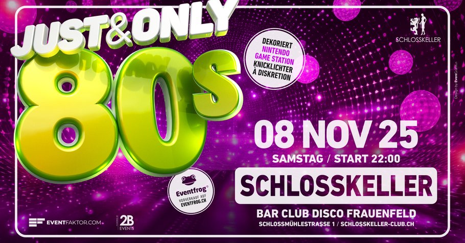Schlosskeller Frauenfeld Schlossmühlestrasse 1,Frauenfeld,SwitzerlandERLEBT DIE MAGISCHE ATMOSPHÄRE DER 80ER JAHRE IM SCHLOSSKELLER FRAUENFELD! Am Samstag, den 08. November 2025, ab 22.00 Uhr bringen wir euch zurück in die Zeit der Neonfarben, Schulterpolster und legendären Hits. 𝙎𝙥𝙚𝙘𝙞𝙖𝙡𝙨: Super Nintendo Game Station für alle Retro-Gaming-Enthusiaste Leuchtende Knicklichter für die perfekte Party-Atmosphäre Diskretion und ausreichend Platz zum Tanzen und Feiern Authentische… Weiterlesen »Just & Only 80s – Schlosskeller Frauenfeld