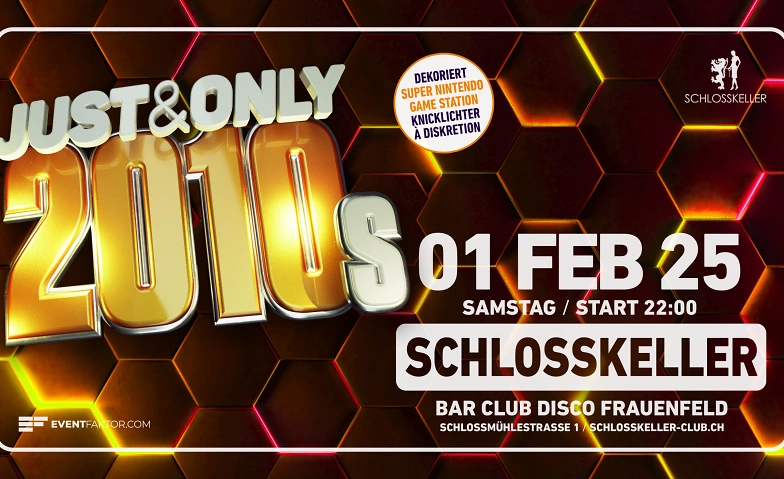 Schlosskeller Frauenfeld Schlossmühlestrasse 1,Frauenfeld,SwitzerlandAm Samstag, 01. Februar 2025, feiern wir die besten Hits der 2010er Jahre bei der 2010s Just & Only Party im Schlosskeller! Freu dich auf eine Nacht voller unvergesslicher Beats und Highlights aus dem letzten Jahrzehnt. 𝙎𝙥𝙚𝙘𝙞𝙖𝙡𝙨: 2010er-Hits all night long Stylische Deko für das perfekte 2010er-Feeling Super Nintendo Game Station für den Retro-Gaming-Spaß Knicklichter… Weiterlesen »Just & Only 2010s im Schlosskeller Frauenfeld