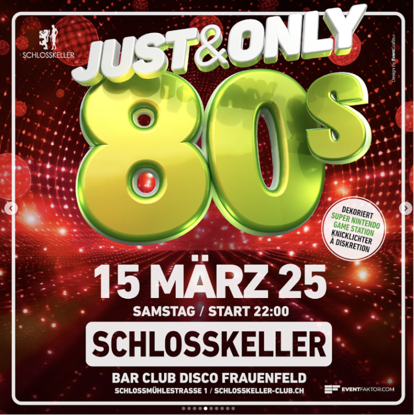 Schlosskeller Frauenfeld Schlossmühlestrasse 1,Frauenfeld,SwitzerlandErlebt die magische Atmosphäre der 80er Jahre im Schlosskeller Frauenfeld! Am Samstag, den 15. März 2025, ab 22.00 Uhr bringen wir euch zurück in die Zeit der Neonfarben, Schulterpolster und legendären Hits. 𝙎𝙥𝙚𝙘𝙞𝙖𝙡𝙨: Super Nintendo Game Station für alle Retro-Gaming-Enthusiaste Leuchtende Knicklichter für die perfekte Party-Atmosphäre Diskretion und ausreichend Platz zum Tanzen und Feiern Authentische… Weiterlesen »80’s Just & Only im Schlosskeller Frauenfeld