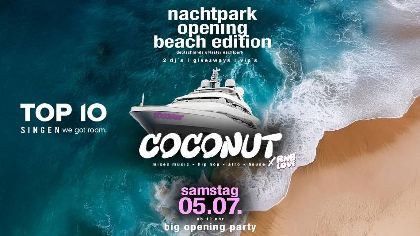 TOP10 Singen Otto-Hahn-Str. 5,Singen (Hohentwiel),GermanyCoconut Beach Edition â Die groĂe Nachtpark-Eröffnung im TOP 10 Singen Am Samstag, den 05. Juli, verwandelt sich das TOP 10 Singen in Deutschlands gröĂten Nachtpark â und das mit einer exklusiven Beach Edition! Unter dem Motto âCoconutâ lĂ€dt der legendĂ€re Nachtclub zur groĂen Opening Party und setzt damit neue MaĂstĂ€be in der Clubszene. Freut… Weiterlesen »coconut & big opening Party – Top10 Singen
