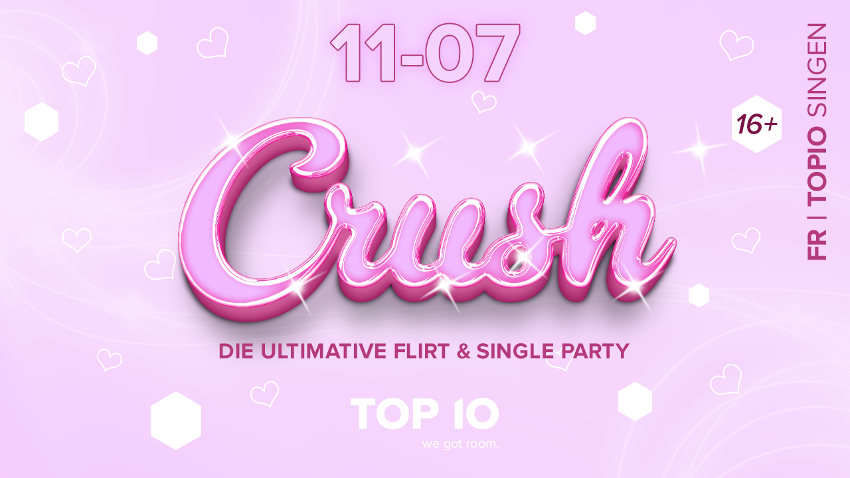 TOP10 Singen Otto-Hahn-Str. 5,Singen (Hohentwiel),GermanyCrush â Die ultimative Flirt- und Single-Party! Bist du bereit fĂŒr einen unvergesslichen Abend voller SpaĂ, Flirts und neuer Bekanntschaften? Dann komm zu âCrushâ! Hier erwarten dich spannende Aktionen, die speziell fĂŒr Singles gedacht sind! Was dich erwartet:  Speed-Dating: Lerne in kurzer Zeit viele neue Leute kennen!  Sektempfang fĂŒr alle Single Ladies Flirtspiele: Nimm an lustigen Spielen teil,… Weiterlesen »Crush im Top10 Singen